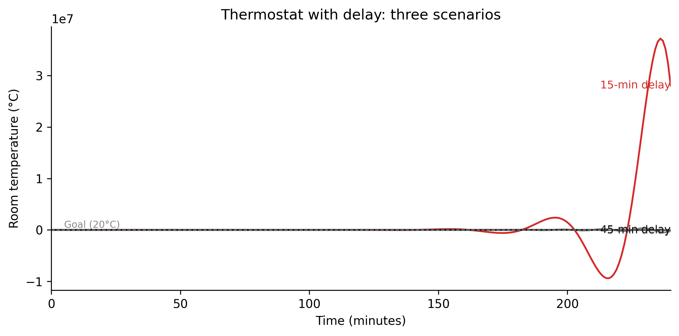 Exercise 2.3 asks you to trace the thermostat’s behaviour by hand under different delay assumptions; the code below runs those same assumptions across 240 minutes so the trajectories are visible at once. The three scenarios use identical parameters — same goal, same feedback gain, same starting temperature — and differ only in delay length, which is enough to produce three qualitatively distinct behaviours from the same balancing loop structure.