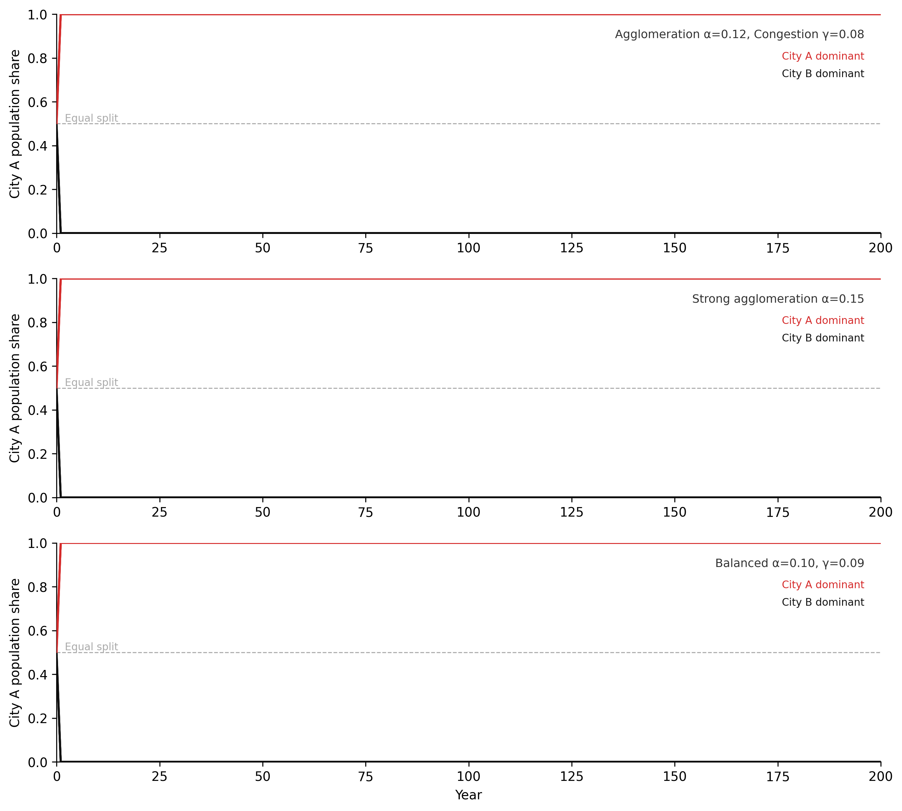 print(f"City A dominant: {a_dom}/{n_seeds} | City B dominant: {b_dom}/{n_seeds} | Near-equal: {mid}/{n_seeds}")Figure 5.5. Two-city agglomeration model across three parameter scenarios (Scenario 1: α=0.12, γ=0.08; Scenario 2: α=0.15, γ=0.08; Scenario 3: α=0.10, γ=0.09), each run eight times from randomly perturbed equal initial conditions. Red traces: City A ends dominant (share > 0.55). Black traces: City B ends dominant (share < 0.45). Grey traces: near-equal outcomes. The reinforcing agglomeration loop amplifies tiny early advantages into near-complete dominance; the balancing congestion loop determines the speed and ceiling of that dominance. Path dependence is visible in every panel: structural parameters determine the shape of the outcome distribution, not which city wins.